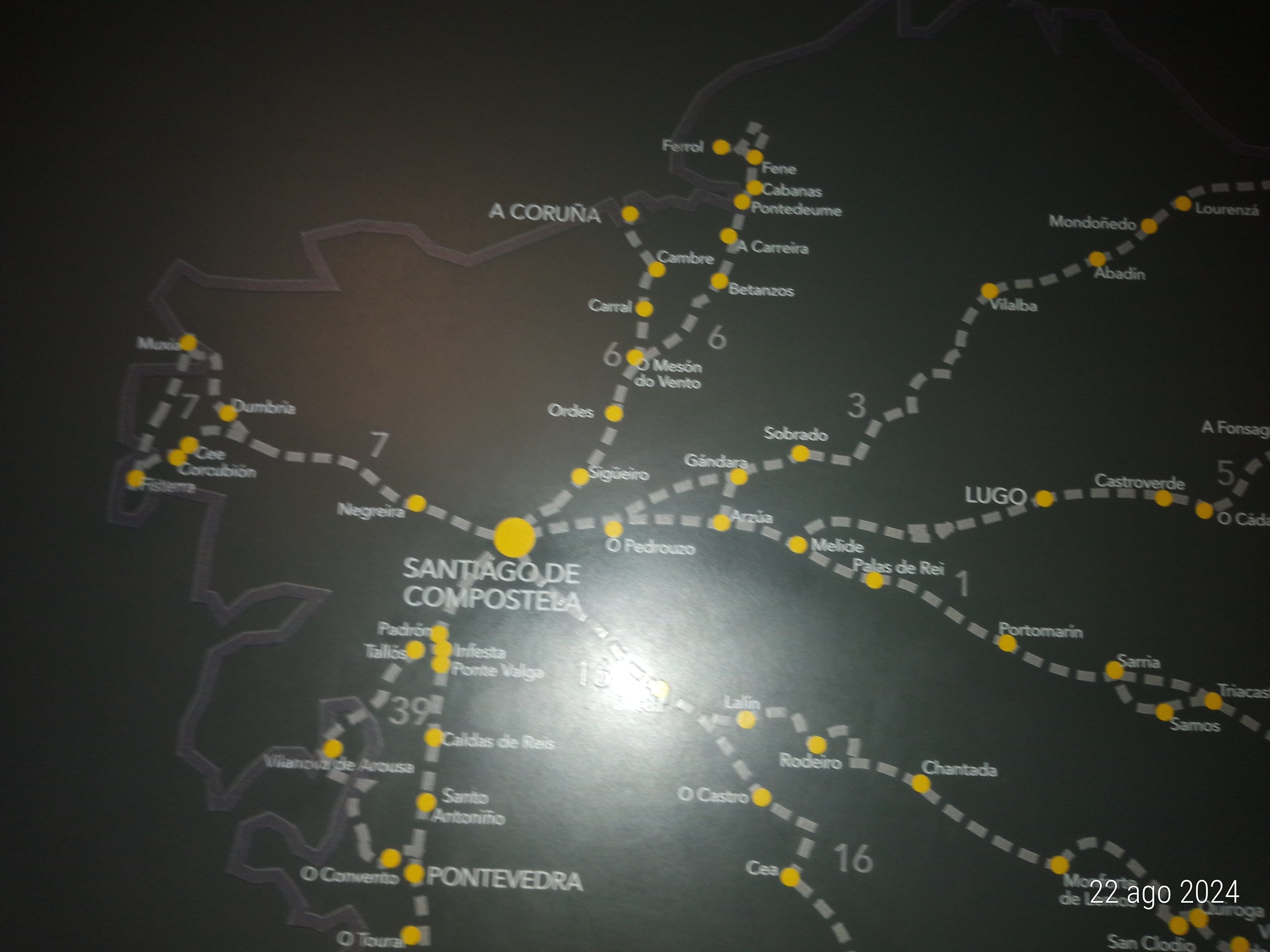 Nel posto ristoro al termine della penultima tappa, i titolari ammonticchiano tazze di cafè con leche, boccali di Cerveza e panini extralarge sul bancone affollato di pellegrini stravolti ma euforici. Mangi e bevi anche tu come se non ci fosse un domani, come se domani non fosse il grande giorno dell’arrivo a Santiago; potrai sognarlo con comodo una volta raggiunto l’ostello in cui passerai la notte – purtroppo no, non è quello dall’altra parte della strada ma un altro, a dieci minuti a piedi da lì. Dieci minuti son pochi se sei in forma, troppi se la combinazione cibo+birra+fatica ti impiomba le gambe: provi a muoverle ma niente da fare – sei arrivata.